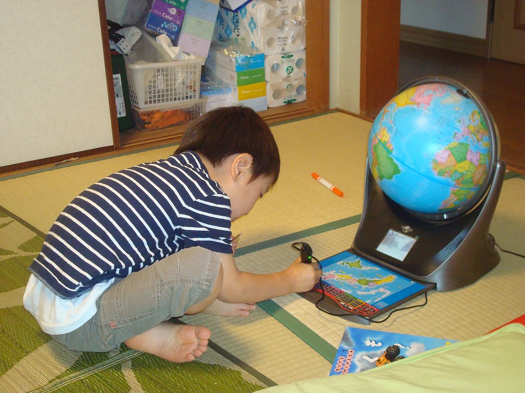 甥の誕生日プレゼントに便乗して息子にも来た「しゃべる地球儀」。教育玩具はハイテクだ。地球儀上をタッチペンで示すと、正面の液晶画面にその国の解説が映像で流れる。