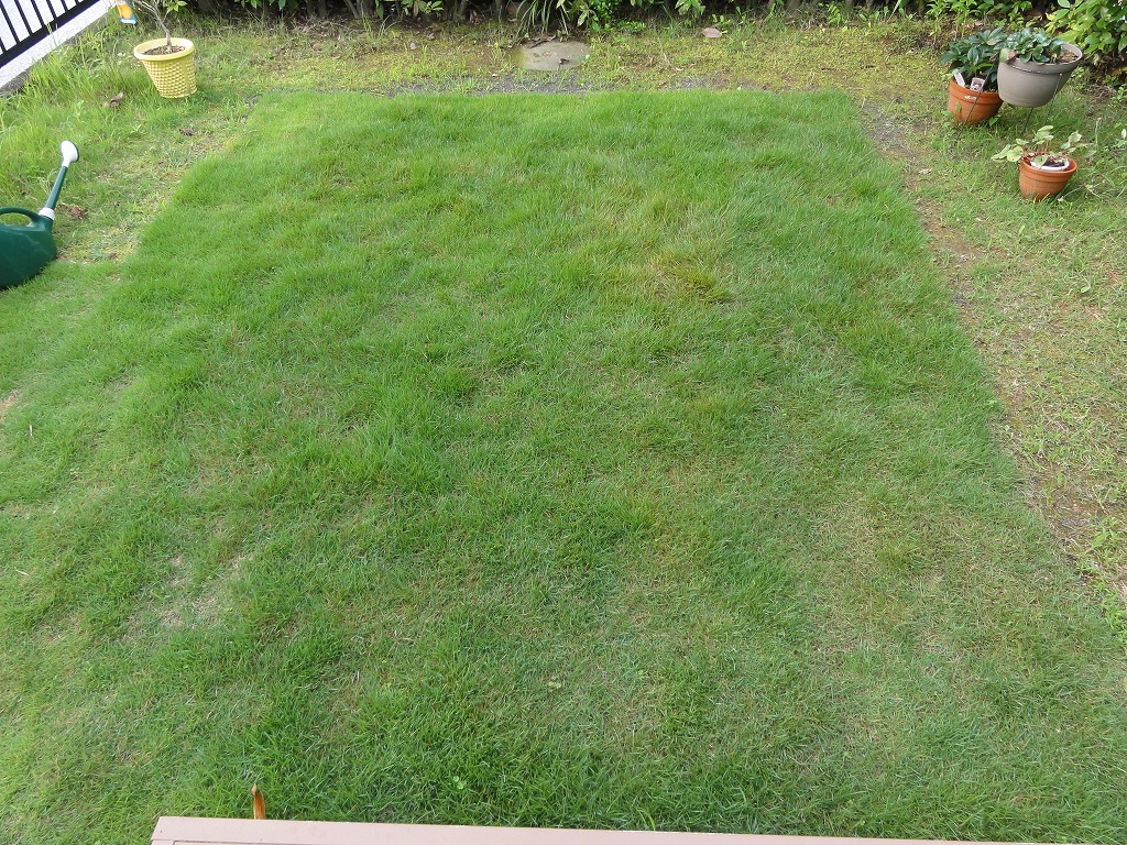水をたっぷり与えて根の定着をはかっていた芝も伸び放題。セフティ3のおすかるを買って、バッサリと刈る。ちょっと、伸び伸び生やしすぎたか。