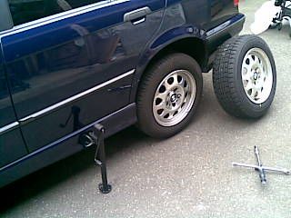 サブロー(E36)のタイヤをスタッドレスに履き替え。トランクから純正ジャッキを出したら、これは新品。同じエリプソイドの純正ホイールなので、変わり映えはしませんが、195/65R15が7Jのリム幅で若干引っ張りタイヤになっている分、タイヤが引っ込んで見える印象。外した夏タイヤホイールの裏側を洗ったら、泥とブレーキのダストが固まったものがこびりついていて、爪まで真っ黒になった。<