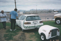 | これは後に話題になりました、ACプロパルジョンのシビック。 GMインパクトのようにセンタートンネルを大きくしてそこにバッテリーを収めており、 また、発電機を引っ張ることで航続距離を伸ばしています。 ロスからフェニックスまで自走して、しかも発電機は必要なかったと言ってましたが、 本当かどうかは知りません。 |