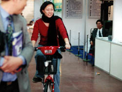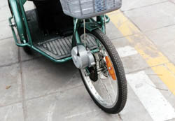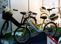 自動車の方は登録するのに免許証を見せて署名もしなければ ならないので並んでも乗るのは大変ですが、自転車の方は 気楽にチケットをもらって乗っていました。 面白いのは、右側の3輪車。 いわゆるおばちゃん御用達のワゴンタイプの自転車ですが、 ペダルもなく完全に電力駆動のみ。 電池はお尻の下で、フロントにモーターが付いているFF方式。 |