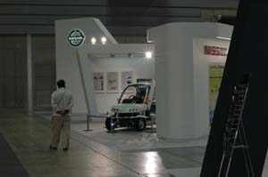 で、早慶の「慶」の方は、というと... モーターショウ展示の経験が豊富なので、 ブース作りは手馴れたものです。 |