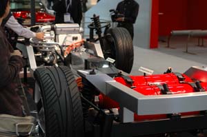 レクサスGS450ハイブリッドのベアモデル。 お客様の要求に妥協を許さないのが目標だろうが、 居住性も考えると、搭載コンポーネントが多い ハイブリッド車はレイアウトが厳しい。 |
