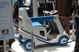 スズキの燃料電池セニアカー「mio」 セニアカーというと、トロトロと歩道を走る ジジ臭いイメージがあるが、バー型のドアと 色使いで、案外お洒落に見えるんじゃないか?と思った。 |