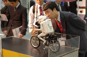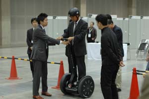 | 「おっ」と、思ったらセグウェイ試乗開始していました。 なぜか、日本SGIが 代理店契約をして、工場内の移動手段用途などに売り出すというニュースは 聞いていました。 この人も初めて乗るのでしょうが、簡単に説明を受けて走り出したら.... | |