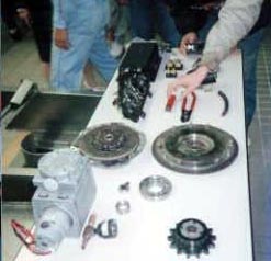 第四回目のEV手作り教室。 先に、清水浩による「モーター・コントローラ理論」の講義があり、 このあとで地下1階の作業場で組み付け作業。 取り付けられる部品をならべて、まずは説明というところです。 |