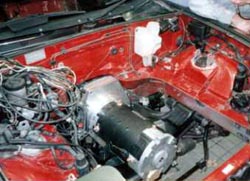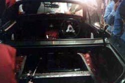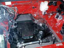 空になっている、ユーノスロードスターのボンネット内部。 補機類もないと、ボンネットの中身はこんな風。 あるのはステアリング関係と、ブレーキや、ウォシャーのタンクぐらい。 |