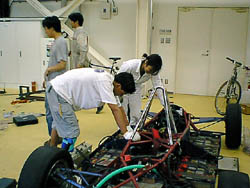 | 今年は多摩美大との共同研究を行っているので、多摩美大の 学生さんたちの訪問をうける。 共同研究は、新しい自動車のコンセプトを作ろうという目標ですが、 まぁ、とりあえず今まで作ってきたコンバート車に試乗していただきましょう ということで、試乗会。 | |