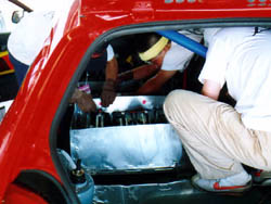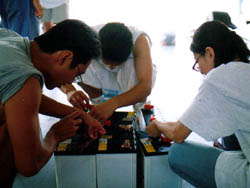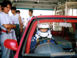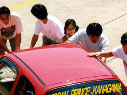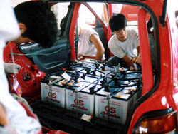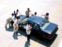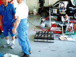 なんで走らねぇんだぁー、と懸命の原因究明の結果死にかけ、というより ほぼ死んでいる内部抵抗が大きな電池が一つ混ざっていることが判明。 直列では一つ仕事をしないやつがいると、そいつに引っ張られてしまうのです。 原因が分かってから、決勝も走れるよう嘆願書。 せっかくこの日のために用意をしてはるばる神奈川から運んできたので、どうにか 走らせてもらうようにお願いする。 なんか、毎年嘆願書書いているような気もしないではない。 |