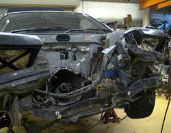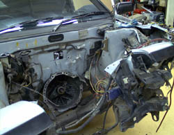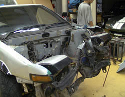 バンパーを外し、モーターも下ろされると、ボデーの受けた 衝撃の大きさがまざまざと見せられる。 |