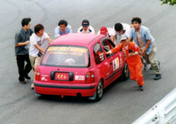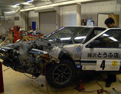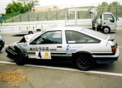 ほかのクルマは帰ってきたのに、「とうふ号」だけ帰ってこない。 最後に帰ってきたブラッシュボーイズの藤沢さんに「86知りませんか?」と聞いたら、 「イィー物見せてもらったよ」との答え。 ピットレーンの入り口で見事に刺さってるよ、とのお話。 |