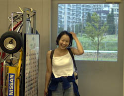 | 「とうふ号」解体の辛い作業の中、木越嬢登場。 夏は薄着でちょっとセクシーだわっ。 | |