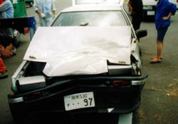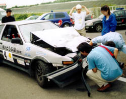 「とうふ号」は、清水研の3台のハコ車の中で唯一ボンネット内に 駆動用の電池を置かないので、クッラッシャブルゾーンはもっとも広い。 電解液をコース上にばら撒いていたら、それこそ大変だったので、 このことだけは不幸中の幸い。 バンパーが「く」の字で、モーターマウントの鉄材まで曲げているが、 真っ直ぐぶつかった分、モーターのシャフトが曲がることはないのでモーターは生きていそうだ。 問題は左側の潰れ具合で、低圧12Vの補機類用バッテリーがリトラと フェンダーに挟まれて動けなくなっている。 |