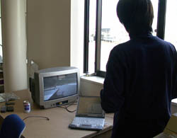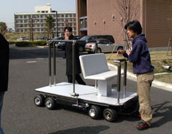 | 遠隔操縦は車両に取り付けられたカメラを見ながら運転しますが、 一つのカメラで車両感覚もつかみにくいこともあり、電波が悪く なると画像が乱れたりするので、見える範囲だったら直に目で 見ながら操縦してもいいのです。操縦は、ゲーム用のパッド。 | |