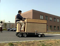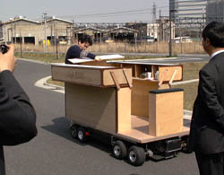 | ついにやってきた、 一畳カー の発表会。 まぁ、簡単にいいますと、自動運転して事故が絶対起きない 自動車社会がきたとしますと、一畳サイズで自動車やその他の 移動手段が実現できるという、そういうコンセプトです。 | |