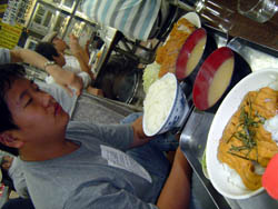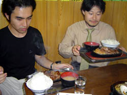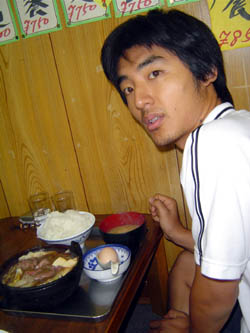 まぁ、しかし市場市場初体験ということで、あまり無理せず普通盛りご飯です。 でー、ご飯が揃ったところ。橋本君の頼んだすきやき定食はうまそうですねー。 |