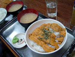 | こちらが、うに丼でございます。 色々とHPで大盛り好きな方々のレポートを見てみますと、 あまり手を加えない、うに系とか、ステーキ系とか、 その辺りを推奨されておりました。 トン汁はお勧めしないとか。 | |