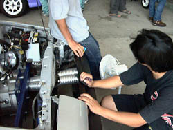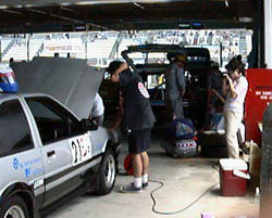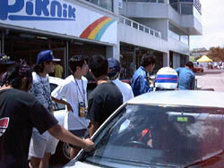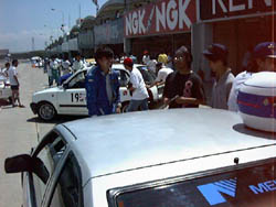 朝九時から、順番に出張車検。 FIAのおっちゃんが来て、「このバッテリーケースは車体に固定されて いないからだめだよ」「ヨーロッパじゃ人死んでるよ」と脅されましたが、 それでも車検は通過。 青のPPバンドが、か弱い命綱です。 |