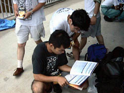 パンフレットも配られて、研究中(?) ソーラーカーについてはたくさんページが割かれているのですが、 EVレースについては、オープン、ストックそれぞれのクラスに見開き 半ページずつしかないのが、ちょっと不満。 ソーラーカーレースの前座みたいなものだからしかたないのか。 |
