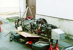 裸になったfjのフレーム。 床板がベニヤなのが気にいらねぇという人もいましたが、まぁ 所詮fj1600レベルならいいのでしょう。 スチールパイプのフレームですが、4人ほどいれば動かせるほど 軽いものです。 |