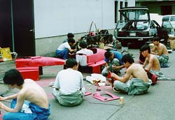 カウル磨き部隊。 このfjのカウルは、かなり痛んでいました。 欠ていたり、割れている部分もありましたし、割れたあとの 補修がいい加減で段差になっていましたから、 磨いてパテで補修をして面をだします。 |