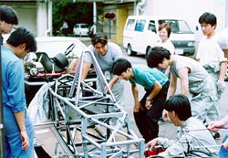 フレームとバッテリーのフレームをつなぐ溶接は プロにお願いしてつけてもらいました。 フレームを持ち上げながら溶接しなければならないので、光をみないように 皆が後ろ向いてます。 こう見るとおかしいですね。 |