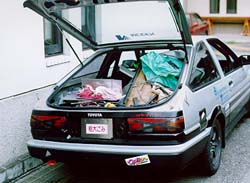 粗大ごみ仕様のEV86が、まさに山に捨ててある 不法投棄の自動車状態になってます。 荷物を置いておくところがあまりないので、 結局EV86の車内に詰め込むと、こんな風になってしまうのです。 |