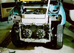 プロトタイプだけあって、この車に「整備性」という言葉 はありません。 コントローラは上下左右がフレームに囲まれているのに加えて、 コントローラの冷却ファンが出っ張っていたりして、 一筋縄では下ろせません。 気合いと根性で、冷却ファンを外し、ケースの上蓋も外して サイズを小さくしたうえで、どうにか下ろせました。 |