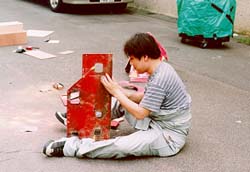 カウルの磨き これは、大仕事です。 地面は削った塗料で真っ赤。 手もツナギも真っ赤になります。 |