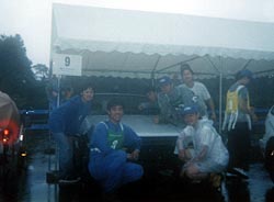 死人が出ているほどの大雨。 長靴、雨カッパの装備で参加です。 今回は、このコンバート1時間チャレンジに加え、ERKジムカーナにも参戦 するため、私はこの日完徹。なにせカートはこの日の朝、動いたばかりでした。 |