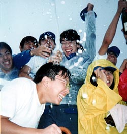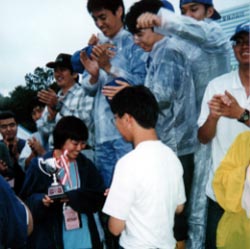 最後に表彰式。 いただきました優勝カップ。 昨年の優勝チームと同じ周回、14周での優勝。 フェスティバルに向けてスペシャルな改造を施したかいがありました。 |