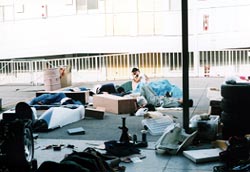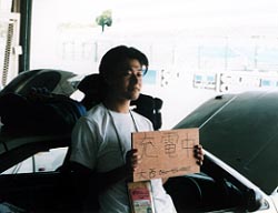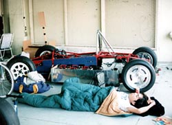 おっ、一人起きたかな。 いや、また寝た。 相変わらず、鈴鹿では野宿の学生軍団なのです。 |