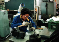プレリュードのモーターにつける減速ギアボックスつくり、ポンチ中 プレリュードグループのキャプテン有冨君の設計。 平歯車のギアでアイドラを挟んで3枚仕様のギアボックスです。 潤滑オイルを入れるのは「オイルを吹くぞ」ということで、潤滑グリス が入ってます。 速度がそれほど出ないので、まぁ熱的に大丈夫でしょうというモクロミ。 |