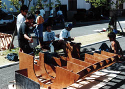 98e段ボールカウル製作中 縦横組み合わせて、お菓子箱のような構造。 これは、前にも実物大モデルの製作を行ったときにつかった方法です。 |