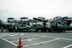 今年の鈴鹿ソーラーカーは、3台体制の参戦です。 ハコシャの2台は、陸送屋さんに頼んで新車輸送に紛れこんで 運ばれてきました。 新車のオデッセイやインスパイヤにまぎれて、10年モノの 2台が載っているのが非常に変な感じです。 98eはレーサーなので、この積載に積むわけにいかず、 私がローダーに積んで一人ではるばる鈴鹿まで トラック運転手の役をやるはめになりました。 |