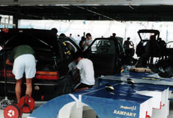 鈴鹿パドックにて ここからが本番です。というのも、プレリュードは電気配線が 終わっていない。ということは、一度も走ったことがないのです。 しかし、車検までには完成させねば。 こんな状況で、コントローラーの配線をし、 電動ドリルでボンネットピンをつけるなど、「パドックでつくる」 現地製作の電気自動車ができがるのです。 |