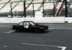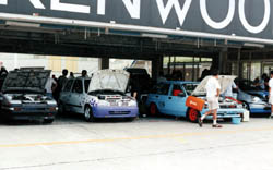 オープンクラスの予選 去年の鈴鹿では数々のトラブルを抱え、オフィシャルの ご好意でグリッドには並べられたものの、結局走れず じまいの悔しい思いをしましたから、その念を晴らすべく 98eの再登場です。 力作の段ボールカウルは、どうでしょうか? 段ボールだけに、どうしても平面が多くなってしまい最近の レースカーとは違う趣きになっていますが、なかなかどうして、 シルエットは格好いいのです。 下手な曲面をつけるよりは、おそらく空力もよいでしょう。 タイヤを隠すフェンダーをつけるだけでも、Cd値は断然改善 されているはずです。 |
