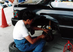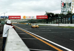 「プロジェクトμ」の協賛をいただいて、ブレーキパッドを供給 してもらったので、今回の3台の車には車名に全部「μ」がつきました。 プレリュードは、「μ作」(μ策)。 パッド交換もする暇がなかったので、パドックで交換。 |