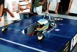 予選終了 EV86は、電池切れで今一つの成績。 逆に、走れるのかが心配だったプレリュード「μ作」の方が 思いがけずよい成績。 ツインモーターのシンプルさと、ギアの騒々しさいう点では、 どこにも負けない車なんです。 |