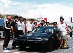 グリッドで記念撮影 最高出力がわずか40kWとパワーは圧倒的に他の直流モーター車に 負けますが、誘導モーターと86のボデーのバランスの良さでは、 いいところ行っていると当人たちの自慢です。 しかし、わずか5周10kmという鈴鹿のレースでは、 どれだけパワーが出せるかが勝負になるので、「勝ちに行く」 ことはどだい無理な話ですから、今回は3度目の正直、「完走するぞ」 が目標です。 |