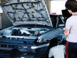 左フェンダーを外します。 こういう作業はオテノモノ。 帰りには、東名でフェンダーの外れた変な86が積載トレーラに 載せられているとの目撃証言あり。 「とうふ店」と書かれた鬼キャンの86がフェンダー外されて 載っている光景を見た人はよほどおかしかったことだろうな。 |