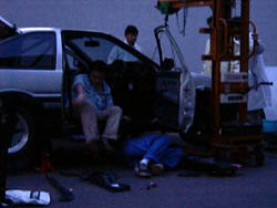 クレーンで降ろされる4AG。 1600ccの比較的コンパクトなエンジンとはいっても、重い のでチェーンブロックやクレーンがないととても降ろせません。 まぁ、エンジン単体で捨てるつもりなら、穴ほって文字通り 落せばいいんですけどね。 |