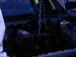 作業開始が遅かったこともあって、エンジンを吊るころになると もうマッ暗。 でも、エンジンを落す(降ろす)ところまでは、初日に終らせて おきたいことなので、作業を続けます。 |
