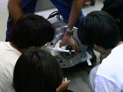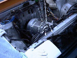 センターを出したクラッチ板に変速機側の軸を挿入するのが 難しく、なかなか奥へモーターが入っていってくれません。 左右に揺らし、クレーンの吊る角度を変え、なだめすかして、 やっと取り付けられたところです。 |