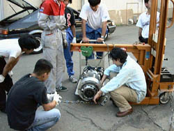 一通り終ったところで、コンバート作業に戻ります。 今度はモーターの組み付けです。 モーターも重量が大きいので、エンジンと同じように クレーンで吊って取り付けます。 |