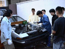 この日は、機械加工を体験するということで、まず溶接から やっていきます。 目をやられないように面や擦りガラスを通して見ますが、 それでも溶接されている中心は強い光です。 鉄が溶けているので、すごいエネルギーですから、 長袖でないと強い紫外線で日焼けします。 |