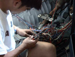 動力用の高圧配線だけでなく、12V低圧系の作業も必要です。 もともと付いている12V系の配線を手繰って必要な配線を見つけないと いけません。 これが一苦労。 |