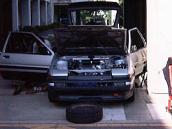 ダッシュボードも全部取り払って中は、こんな状態です。 真ん中の四角いステーはバッテリーの上段を支えるための 柱(通称:ジャングルジム)です。 |