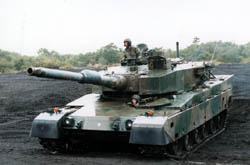 日本で一番新しい戦車。自動装填装置付きの120mm砲に、セラミックやチタンを組み合わせた 複合装甲を持つ、最高水準の戦車だ。 お値段も最高水準で一台9億円。 約50tもの重量がありながら、前進70km/h以上、後退も2段変速で40km/h出る機動性を 備える。 見た目では、複合装甲のおかげでカクいのが特徴。 お値段と重量のおかげで、現在は北海道と富士山にしか配備されていないので、 これに乗るというのは貴重なことなんです。 |