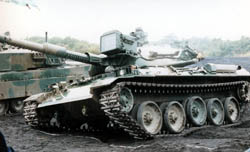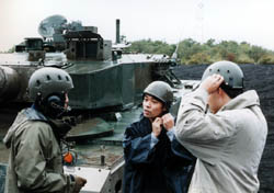 ならんで、試乗出発。 左から90式、74式で、右端は73式装甲車。 いわゆる、歩兵を前線まで送り届ける戦場タクシー。 APCと呼ばれる車輌です。 73APCはアルミ製の車体で軽く、水上航行も可能。 ただ、アルミの装甲はアルミが高温で「燃える」という 性格から最近では敬遠され、今は採用する国もないとか。 それで「アルミなら次はカーボンでしょう」と、ちょっと考えたが、 あれはもっとよく燃えるんだ。そりゃ、だめだね。 |
